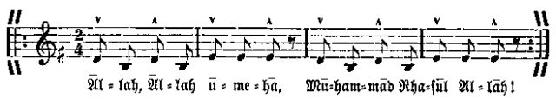 Das Ūmehā ist von Allen mitzubeten, allein nur Schēfakā und später dann auch Bēn Tesālah und Mārah Dūrimēh aus genommen. [16] Diese eigentlich von den »heulenden Derwischen« herübergekommene Gebetsform wird sprechgesungen, und zwar unisono nach folgenden Noten: