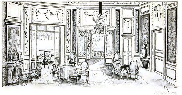 Le grand salon du château. – Au premier plan, à droite, une porte donnant sur une pièce du château. – Immédiatement près de la porte un bouton de sonnerie électrique. – Au-dessus de la porte, au deuxième plan, adossé au mur, un meuble-secrétaire, avec une chaise devant. – À gauche premier plan, une cheminée surmontée d’un portrait enchâssé dans la boiserie. – Au deuxième plan, grand pan coupé au centre duquel s’ouvre une vaste baie donnant de plain-pied sur une terrasse avec vue sur la mer. – Au fond à gauche une grande porte vitrée à quatre vantaux donnant sur le hall du château. – À droite de cette porte, séparée par un pan de mur, une porte assez grande mais à un seul vantail donnant sur la chambre de Maurice. – Tout le fond du hall est vitré permettant de voir le parc dont il est séparé par la balustrade du perron. Face à la porte vitrée du salon, porte vitrée au fond du hall permettant d’accéder dans le parc. – Dans le salon, près et à gauche de la cheminée, un petit fauteuil tourné presque dos au public. – Au-dessus, près et à droite de la cheminée, une chaise longue un osier, avec des coussins. – Un peu au-dessus à droite de la chaise-longue une grande table ronde sur laquelle sont des journaux, des jeux, des ouvrages de dames. – Au milieu une vasque avec des fleurs. – Devant la table un tabouret carré pour s’asseoir. – À droite de la table, un fauteuil ; à gauche entre la chaise-longue et la table, et un peu au-dessus, une chaise dite « fumeuse » avec accoudoir, le siège face au public. – À droite, presque au milieu de la scène un petit meuble « tricoteuse », avec, à sa gauche, un petit fauteuil ; à sa droite une bergère. – Dans la tricoteuse, les trois journaux catholiques dont il sera question ; des pelotes de laine, un ouvrage au tricot. – Au fond, de chaque côté de la porte vitrée, adossée au mur, une chaise à haut dossier. – Lustre en cristal au plafond. – Sur la terrasse, un ou deux fauteuils d’osier ; un télescope sur son trépied. – La banne de la baie est à moitié descendue. – Dans le hall à gauche, grande table d’antichambre recouverte d’un tapis. – Il fait grand soleil dehors. – Toutes les entrées des gens venant de l’intérieur du château, se feront par la droite du hall. – Les entrées venant de l’extérieur se feront naturellement par la porte du fond du hall.