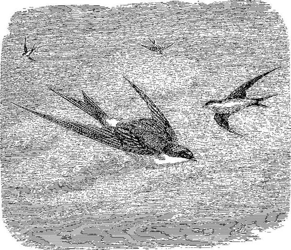 Or nous savons pertinemment aujourd’hui, par les témoignages de nombreux voyageurs-explorateurs, que tandis que nous nous pressons autour de nos foyers, en hiver, l’hirondelle se chauffe gaiement au brillant soleil des oasis d’Afrique. Dès le milieu du siècle dernier, le naturaliste Adanson écrivait à Buffon que dans son long séjour au Sénégal, il avait toujours vu cet oiseau y arriver à l’époque où il quitte la France, et en partir au temps où il nous revient. D’autre part, son passage dans les contrées intermédiaires est constaté partout, comme nous le constatons nous-mêmes lorsque nous voyons les sujets de l’espèce se rassembler en foule pour se préparer au départ, puis disparaître pour repasser en octobre en rasant le sol d’un vol continu et en cinglant droit au Sud, ainsi qu’il sera dit en son lieu. Le continent africain est donc leur lieu de station hivernale, comme l’Europe est leur point de station estivale. Et ainsi des autres oiseaux qui, purement et simplement, changent de climats, grâce aux moyens de locomotion dont la nature les a pourvus, et plus ou moins au loin, selon leur tempérament et leurs conditions d’existence.