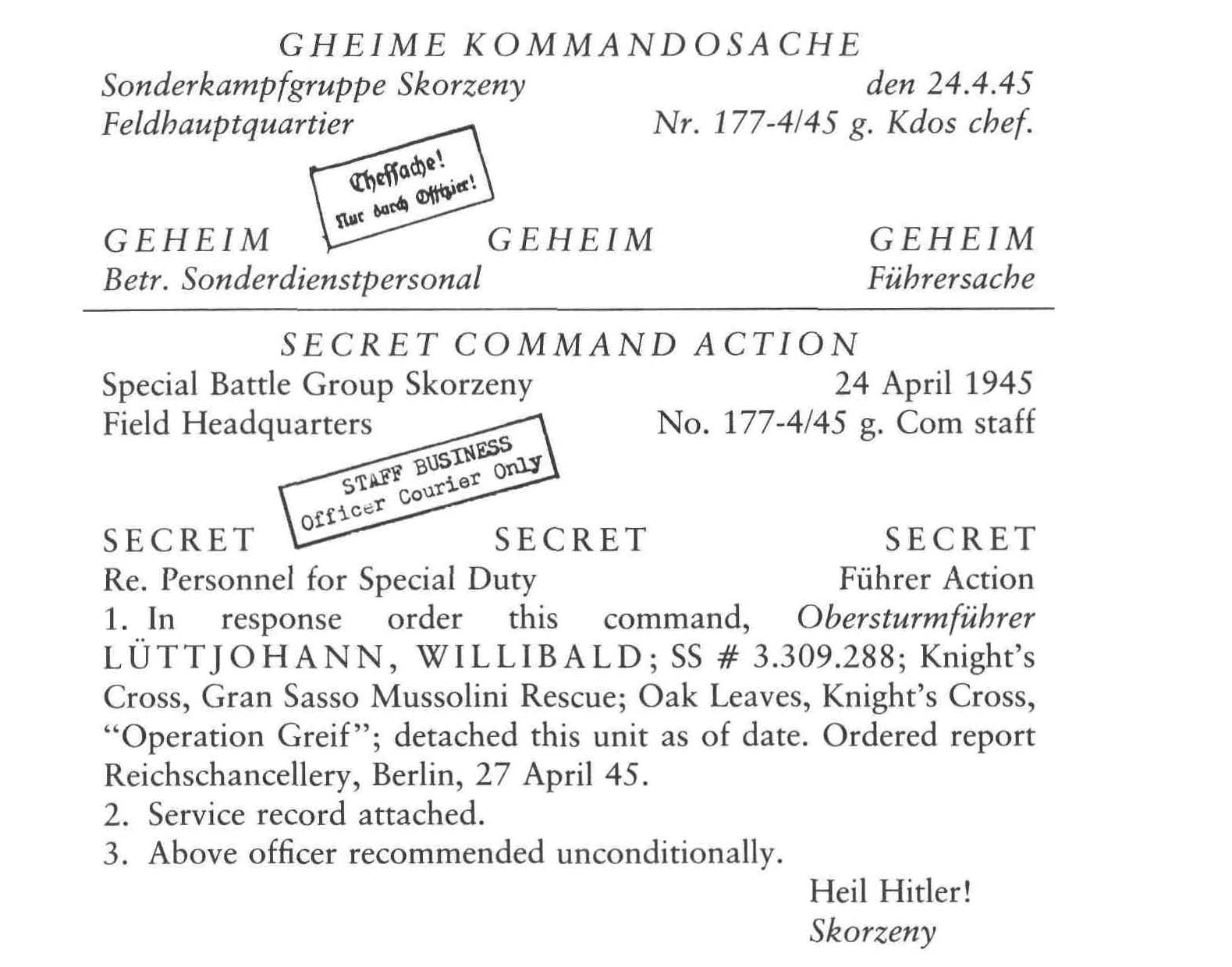 “From Sonderkampfgruppe Skorzeny,” Willi said. “Urgent. For the Führer’s eyes only.”