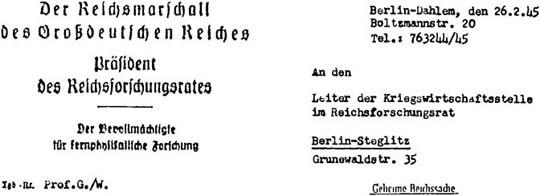 The Reich Marshal of the Greater German Reich President of the Reich Research Council The Authority for Atomic Research Ref. No. Prof. G./W. |