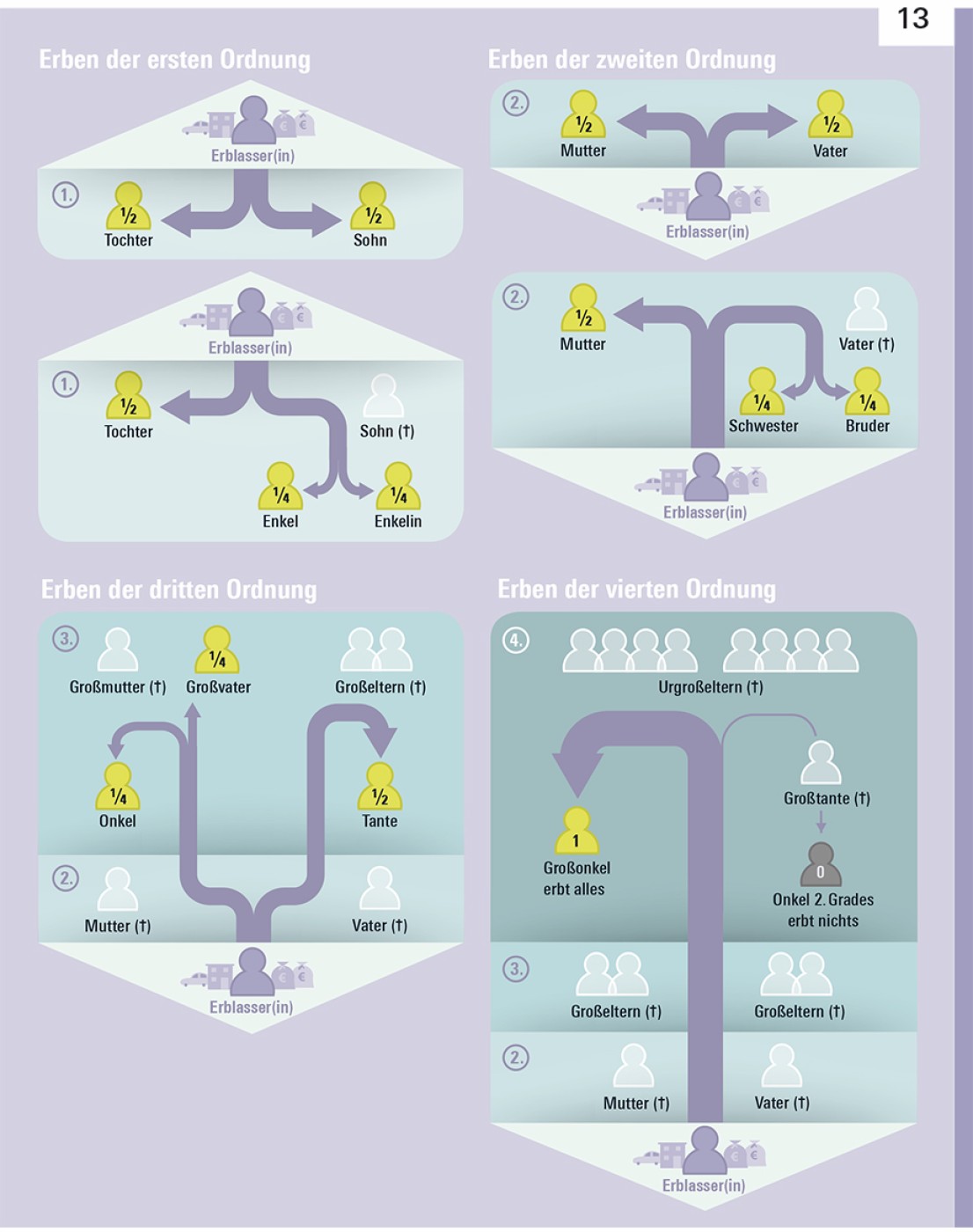 Erben einer früheren Ordnung schließen alle Erben späterer Ordnungen aus. Innerhalb einer Erbenordnung erben zuerst die am nächsten verwandten: Kinder vor Enkeln (1. Ordnung), Eltern vor Geschwistern (2. Ordnung), Großeltern vor Onkeln/Tanten. Lebt die Ehepartnerin/der Ehepartner des Erblassers, erbt auch sie/er: Das Erbrecht des Ehe- oder eingetragenen Lebenspartners steht eigenständig neben dem der Verwandten.