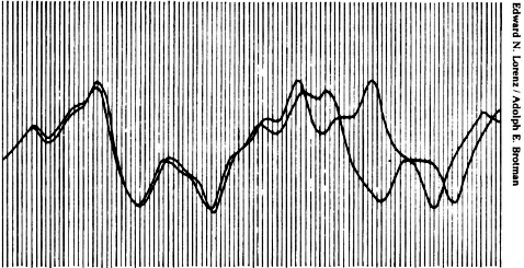 He decided to look more closely at the way two nearly identical runs of weather flowed apart. He copied one of the wavy lines of output onto a transparency and laid it over the other, to inspect the way it diverged. First, two humps matched detail for detail. Then one line began to lag a hairsbreadth behind. By the time the two runs reached the next hump, they were distinctly out of phase. By the third or fourth hump, all similarity had vanished.