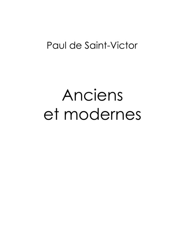 Anciens et modernes forment une suite au livre que l’auteur présentait ainsi au public et les nouveaux articles d’histoire et de littérature que nous publions aujourd’hui auraient pu s’abriter sous le titre de Hommes et Dieux. Paul de Saint-Victor en eût fait sans doute une seconde série de cet ouvrage ; mais Hommes et Dieux avaient été longuement achevés ; ils avaient reçu de l’auteur le coup de perfection qui en fait une œuvre définitive à laquelle un autre que lui n’avait pas le droit d’ajouter.