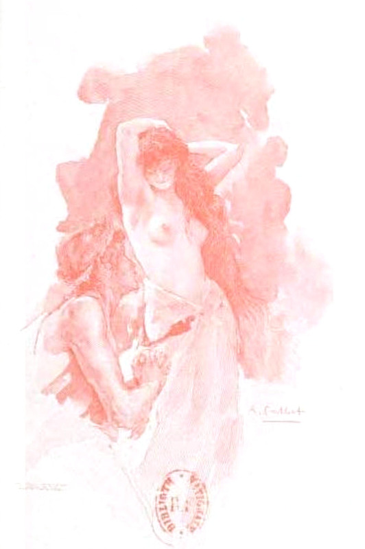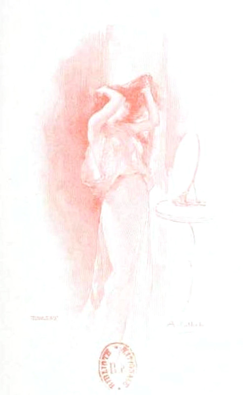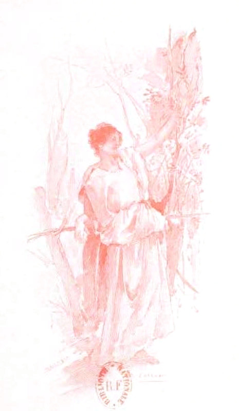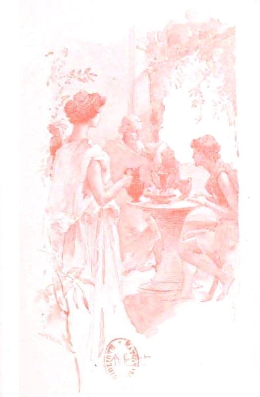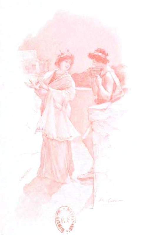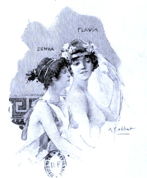 Un groupe de filles, sur une terrasse, traçait l’ornement des vases. Attentives, elles répétaient de la pointe du style quelque jeu de faunes, quelque scène rustique ou simplement des lignes harmonieuses. Et toutes semblaient pleines de grâce dans leurs stolas légères et parmi les pampres qui ne les laissaient voir qu’à moitié. L’une, la jambe nue élevée sur un trépied, la chevelure un peu retombante, la tête inclinée, montrait les vases clairs de sa poitrine, dans une pose ensemble ingénue et lascive.