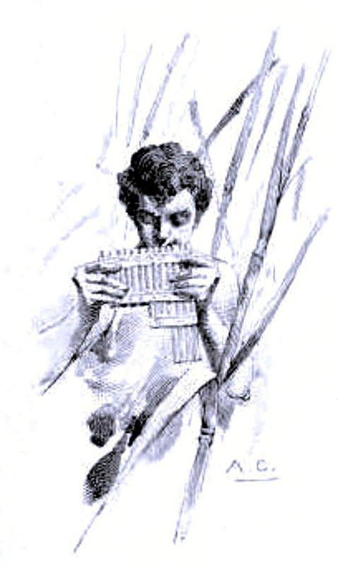Une aimable mélancolie passa dans son cœur. Elle éveilla l’art. Il éleva la flûte à ses lèvres, il soupira son admiration, sa jeunesse et sa pauvreté. Les âmes sonores s’élevèrent et moururent, parmi le bruit des eaux, comme les moucherons d’orage.