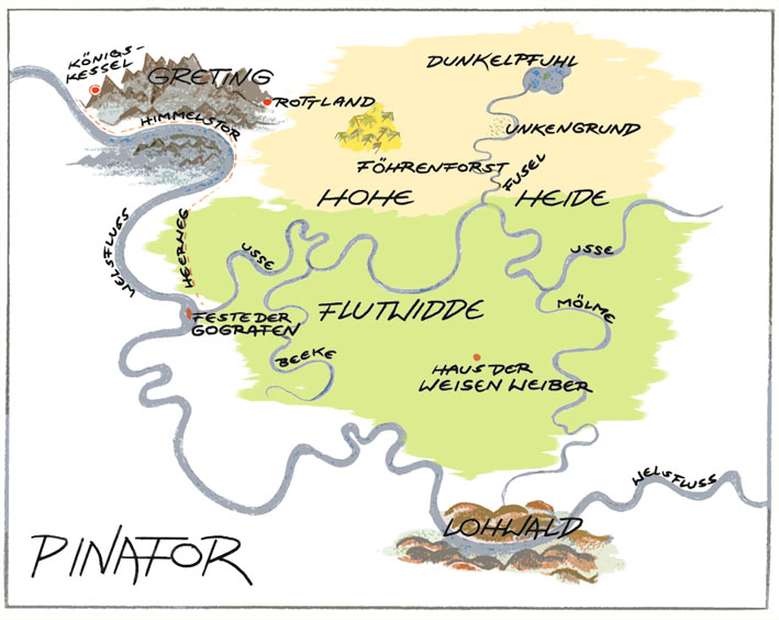 Hans war auch beunruhigt, denn er hatte gehört, dass im Greting, dem Sandsteingebirge im Nordwesten Pinafors, Ungeheuer hausten. Er betrachtete Grimm, der grinsend vor ihnen stand, die Daumen hinter den breiten Gürtel gehakt, an dem sieben Messer, ein Schwert und eine Streitaxt hingen. Grimm sorgte gut für seine Männer, vorausgesetzt, sie waren gehorsam, aber er konnte auch jähzornig und brutal sein, und seine Rachsucht war berüchtigt. Hans hatte miterlebt, wie er Menschen gequält und getötet hatte, ohne mit der Wimper zu zucken, und er empfand eine Mischung aus Bewunderung und Angst für seinen Anführer.