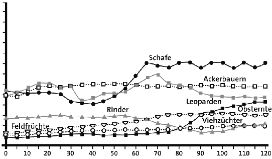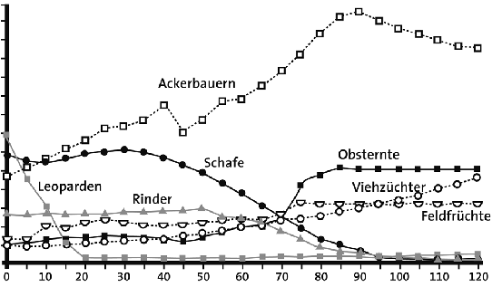 Bei unserer durchschnittlichen Versuchsperson der Abbildung 2 kam es etwa im 88. Monat zu einer nicht mehr auffangbaren Hungerkatastrophe, die allerdings die Vieh züchtenden Moros, die auf einer niedrigeren Entwicklungsstufe verblieben waren, längst nicht in dem Ausmaß traf wie die Tupis, über welche die Segnungen der Kunstdüngung und der medizinischen Versorgung in vollem Umfang «hereingebrochen» waren. Es war das Übliche: Anstehende Probleme (hier: der Nahrungsmittelversorgung und der Gesundheitsfürsorge) wurden gelöst, ohne dass dabei die durch die neuen Problemlösungen entstandenen Fernwirkungen und damit die neuen Probleme, die durch die Problemlösungen erzeugt wurden, gesehen wurden.