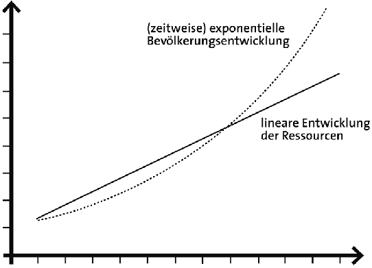 Abb. 3: Die Katastrophenfalle: linearer Zuwachs der Ressourcen und exponentieller Zuwachs der Bevölkerung