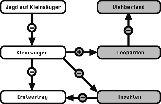 Was waren die Gründe für Erfolg und Misserfolg? Sie lagen keineswegs darin, dass etwa die «gute» Versuchsperson über ein Fachwissen verfügte, welches den anderen Versuchspersonen abging. Tanaland enthielt keine Probleme, die nur mit einem spezifischen Fachwissen zu bewältigen waren. Die Gründe für Erfolg und Misserfolg muss man vielmehr in bestimmten «Denkfiguren» suchen. In einem System, wie es Tanaland darstellt, kann man nicht nur eine Sache tun. Man macht immer mehrerlei, ob man will oder nicht. Abb. 5 zeigt ein Beispiel dafür. Die Erträge von Äckern und Gärten sind in Tanaland zunächst auch deshalb gering, weil Mäuse, Ratten und Affen sich in erheblichem Umfang an diesen Erträgen «beteiligen». Nahe liegend ist es also, diese «Schädlinge» durch Jagd, Fallen und Gift ordentlich zu dezimieren, um auf diese Weise die Erträge zu steigern. Diese Denkfigur ist in Abb. 5 links dargestellt. Was in Wirklichkeit zusätzlich geschieht, sieht man in Abb. 5 rechts. Die Dezimierung der Kleinsäuger und der kleinen Affen wirkt sich zwar zunächst einmal positiv auf die Acker- und Obstbauerträge aus. Zugleich aber können sich nun Insekten, die auch eine Beute der Kleinsäuger darstellten, ungehemmter vermehren. Und zugleich wird den großen Raubkatzen ein Teil ihrer Beute entzogen, worauf sich diese dem Viehbestand «zuwenden». Es ist also demnach möglich, dass die Dezimierung der Kleinsäuger und der Affen «unter dem Strich» nicht nur nichts nützt, sondern schadet. Die Nichteinrechnung solcher Neben- und Fernwirkung von Maßnahmen war ein Grund für den Misserfolg, den die meisten unserer Versuchspersonen beim Umgang mit Tanaland hatten.
