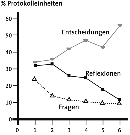 Abb. 6: Entscheidungen, Reflexionen und Fragen: die Entwicklung über die sechs Sitzungen