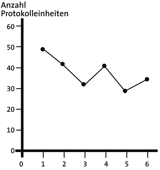 Insgesamt wurden die Versuchssitzungen auch immer kürzer, wie sich deutlich an der Anzahl der Protokollelemente in den einzelnen Sitzungen zeigt. In Abb. 7 sieht man die durchschnittliche Anzahl der Protokollelemente unserer 12 Versuchspersonen in den 6 Sitzungen. Man sieht, dass in der ersten Sitzung durchschnittlich fast 50 Protokollelemente nötig waren, um das Verhalten der Versuchspersonen zu beschreiben. In der dritten bis fünften Sitzung waren nur noch durchschnittlich etwa 30 Protokollelemente notwendig. Die Versuchspersonen hatten in den ersten Versuchssitzungen ihren Umgangsstil mit Tanaland entwickelt und änderten diesen nun nicht mehr sehr. Ihr schließlicher Misserfolg zeigt aber deutlich, dass mehr Nachdenken und weniger «Machen» durchaus am Platz gewesen wären.