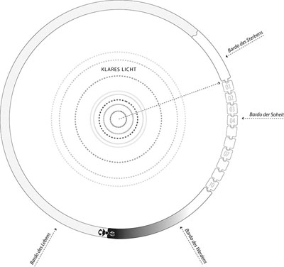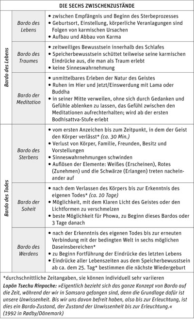 Um das Verständnis für die verschiedenen Zustände und Verhaltensweisen des Geistes zu erleichtern, unterteilen die buddhistischen Belehrungen den Kreislauf des Lebens. Er besteht zwar aus einer beständigen Kette von aneinanderhängenden Augenblicken, lässt sich aber in Zwischenzustände gliedern. Solche Zwischenzustände von einem bestimmten Anfangspunkt bis zu einem bestimmten Endpunkt werden mit dem Begriff »Bardo« bezeichnet. Wörtlich übersetzt bedeutet er »Lücke« oder »zwischen«. Es gibt unendlich viele solcher Bardos, denn alles verändert sich ständig. So gesehen, befindet man sich – bis zur Erleuchtung – stets im Übergang von einem Zustand zum anderen. Allgemein verstanden bezeichnet Bardo den Zwischenzustand zwischen dem jetzigen Leben und der Wiedergeburt in das darauffolgende Leben. Nur der Zustand, in dem der Wissende seine eigene Zeitlosigkeit erkennt – Befreiung oder Erleuchtung –, ist kein Bardo.