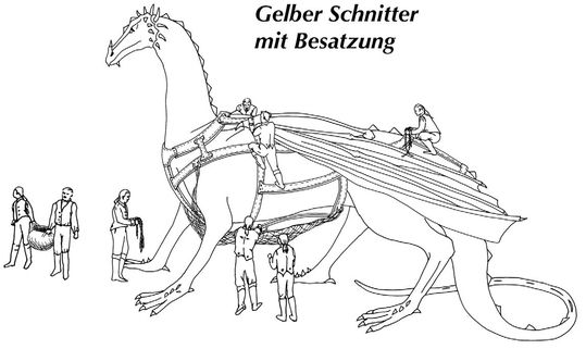 … Auch ist es gut, sich in Erinnerung zu rufen, dass die Gelben Schnitter, auf die so häufig mit der Verachtung herabgeblickt wird, die man dem Altvertrauten entgegenbringt, aufgrund ihrer vielen hervorragenden Eigenschaften überall zu finden sind. Im Allgemeinen sind sie zäh und wenig wählerisch bei ihrer Nahrung. Außer bei den schlimmsten Extremen von Hitze oder Kälte zeigen sie sich Temperaturen gegenüber unempfindlich, sind fast immer von freundlichem Charakter, und sie haben beinahe zu jeder Blutlinie dieser Inseln beigetragen. Zumeist handelt es sich bei diesen Drachen um mittelgewichtige Tiere, auch wenn es innerhalb der Rasse größere Schwankungen als üblich gibt und ein Gewicht von etwa 10 Tonnen bis 17 Tonnen bei einem besonders großen Exemplar beobachtet werden kann. Als normal gilt ein Gewicht zwischen 12 und 15 Tonnen bei einer Länge von 15 Metern und einer gut ausgewogenen Flügelspannweite von etwa 25 Metern.