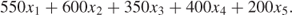 In order to create a mathematical model, we introduce variables x1, x2, …, x5 representing the numbers of PROD 1, PROD 2, …, PROD 5 that should be produced in a week. As each unit of PROD 1 yields £550 contribution to profit and each unit of PROD 2 yields £600 contribution to profit, etc., our total profit contribution will be represented by the expression: