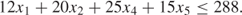 Clearly, our processing and labour capacities, to some extent, limit the values that the xj can take. Given that we have only three grinding machines working for a total of 96 hours a week each, we have 288 hours of grinding capacity available. Each unit of PROD 1 uses 12 hours grinding. x1 units will therefore use 12x1 hours. Similarly, x2 units of PROD 2 will use 20x2 hours. The total amount of grinding capacity that we use in a week is given by the expression on the left-hand side of Inequality (1.2):
