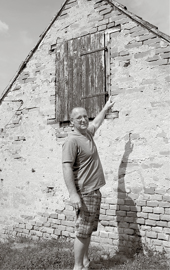 1) Einschusslöcher in der Giebelmauer eines Weinkellers in Altlichtenwarth: Gerhard Hofmeister auf den Spuren der letzten Kriegswochen.