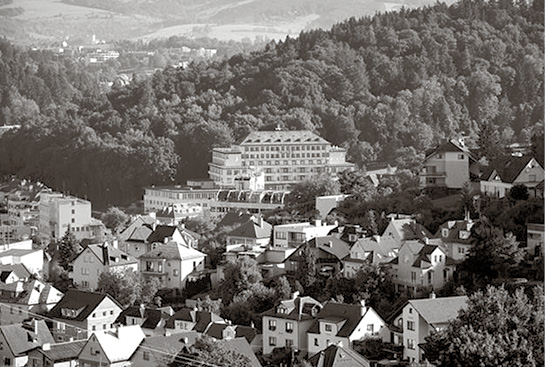 2) Blick auf den tschechischen Kurort Lázně Luhačovice; im Hintergrund vor dem Wald das Palace-Hotel.