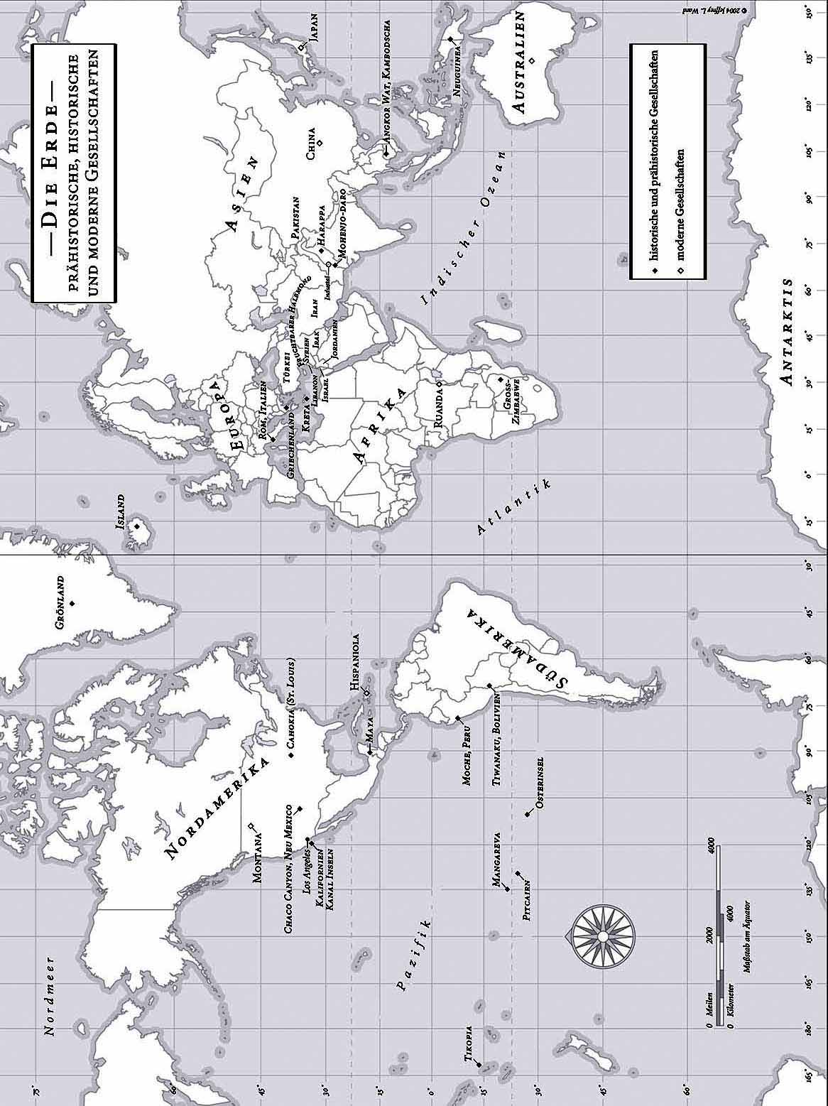 Normannisch-Grönland ist nur eine der vielen früheren Gesellschaften, die zusammenbrachen oder verschwanden und gigantische Ruinen hinterließen, wie Shelley sie in seinem Gedicht »Ozymandias« beschreibt. Unter »Zusammenbruch« verstehe ich einen drastischen Rückgang der Bevölkerungszahl und/oder der politisch-wirtschaftlich-sozialen Komplexität, der sich auf ein größeres Gebiet erstreckt und längere Zeit andauert. Das Phänomen des Zusammenbruchs ist also die Extremform des Niederganges, den es auch in schwächerer Ausprägung gibt; wie drastisch der Verfall einer Gesellschaft sein muss, bevor man ihn als Zusammenbruch bezeichnet, ist eine willkürliche Festlegung. Zu den milderen Formen des Niederganges gehören die normalen Schwankungen des Wohlstandes sowie kleinere politische, wirtschaftliche und soziale Umstrukturierungen, wie sie in jeder Gesellschaft vorkommen; die eine wird vielleicht von einem Nachbarn erobert, oder ihr Niedergang ist an den Aufstieg des Nachbarn gekoppelt, ohne dass sich dabei aber die Gesamtbevölkerungszahl oder die Komplexität der Region verändert, in einer anderen wird die herrschende Elite durch eine andere gestürzt oder verdrängt. Von einem vollständigen Zusammenbruch und nicht nur von einem geringfügigen Niedergang würde man nach solchen Maßstäben wahrscheinlich in folgenden Fällen sprechen: bei den Anasazi und Cahokia auf dem Gebiet der heutigen USA; bei den Mayastädten Mittelamerikas; bei den Gesellschaften der Moche und Tiwanaku in Südamerika; bei der mykenischen Kultur Griechenlands und der minoischen Kultur Kretas in Europa; bei Großzimbabwe und den Meroe in Afrika; bei Angkor Wat und den Harappan-Städten im Industal in Asien; und bei der Osterinsel im Pazifik.