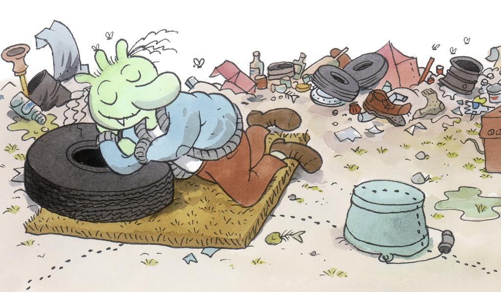 Olchi-Opa hat sich vor der Olchi-Höhle gemütlich auf einer Fußmatte ausgestreckt. Sanfter Wind weht über die Schmuddelfinger Müllkippe. Eine fette Kröte quakt und zwei kleine Mäuse spielen unter einem alten Bettgestell Verstecken. Ein paar Ameisen trippeln über einen Blecheimer. Mit seinen empfindlichen Hörhörnern hört Olchi-Opa das ganz genau.