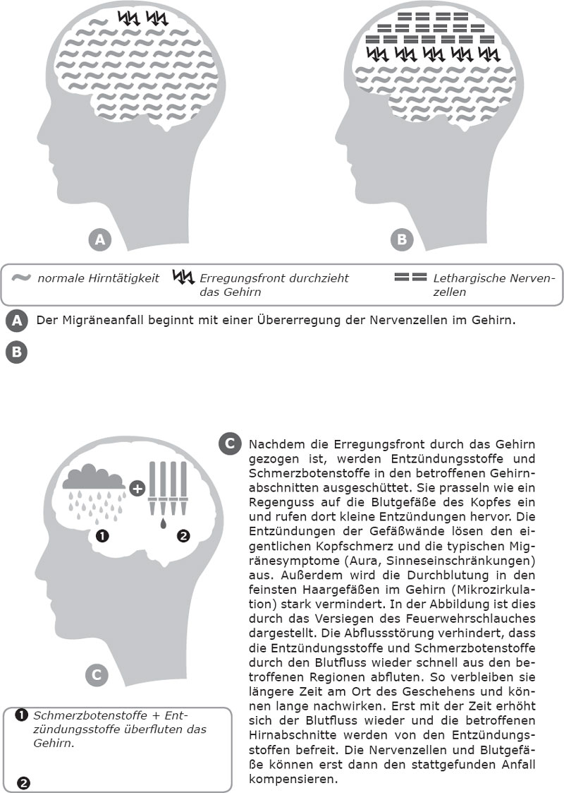 Bei manchen Betroffenen kommt es nach der starken Erregung von Gehirnzellen zur Umkehr der Situation und die Zellen zeigen nur noch eine geringe Aktivität. Wie eine langsam aufziehende Wolkenfront durchzieht dieses Geschehen das Gehirn. Die betroffenen Zellen werden schlechter durchblutet und es kommt zu einer Verschiebung im Magnesiumhaushalt des Gehirns. Dadurch reagieren viele Schmerzrezeptoren empfindlicher und es werden Entzündungsbotenstoffe ausgesendet. Durch das Mikrozirkulationssystem erreichen diese viele verschiedene Gehirnabschnitte. Eine Schmerzattacke mit neurologischen Symptomen (Migräne mit Aura) baut sich auf. Erst wenn sich das System wieder beruhigt hat, verschwindet der Schmerz. Es dauert einige Zeit, bis die verbrauchten Botenstoffe wieder nachgebildet sind und das Gehirn sich von der Attacke erholt hat. In dieser Zeit ist das Gehirn des Betroffenen noch nicht voll leistungsfähig.