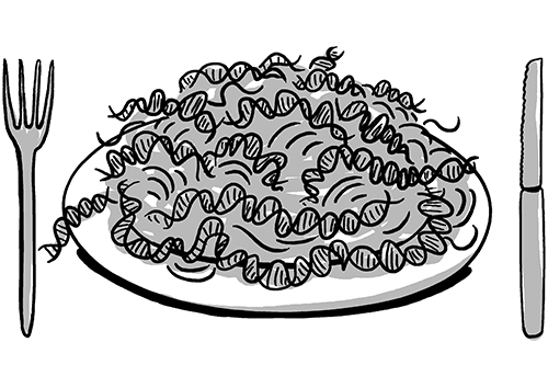 Das ist ja alles ganz schick, aber warum ist die Aufklärung der DNA-Struktur nun der Mondlandungsmoment der Genetik gewesen? Man wusste mit einem Mal, wie die DNA Informationen speichert: In langen Ketten aus DNA-Bausteinen. Es gibt also eine fixe Anordnung, eine Reihenfolge. Sagen wir so: Wenn Sie wissen, in welcher Reihenfolge die Buchstaben in einem Buch stehen, können Sie es lesen. Wenn Sie das nicht wissen, haben Sie eine Tüte Buchstabennudeln: Das ist vielleicht appetitlich, aber der Informationsgehalt geht gegen null.