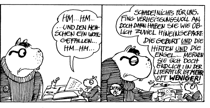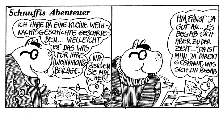 Ich fand sie in der Weihnachtsausgabe des ›Göttinger Tageblatts‹, war vom ersten Satz an gefesselt und in der Mitte ganz und gar bezaubert, als der Verfasser, der verdiente Pastor Johannes Schiller, derart abrupt die längst fällige Kurve vom neckischen Beispiel zur frohen Botschaft kratzte, daß es mich fast vom Frühstückssessel gehauen hätte – aber lesen Sie selbst: