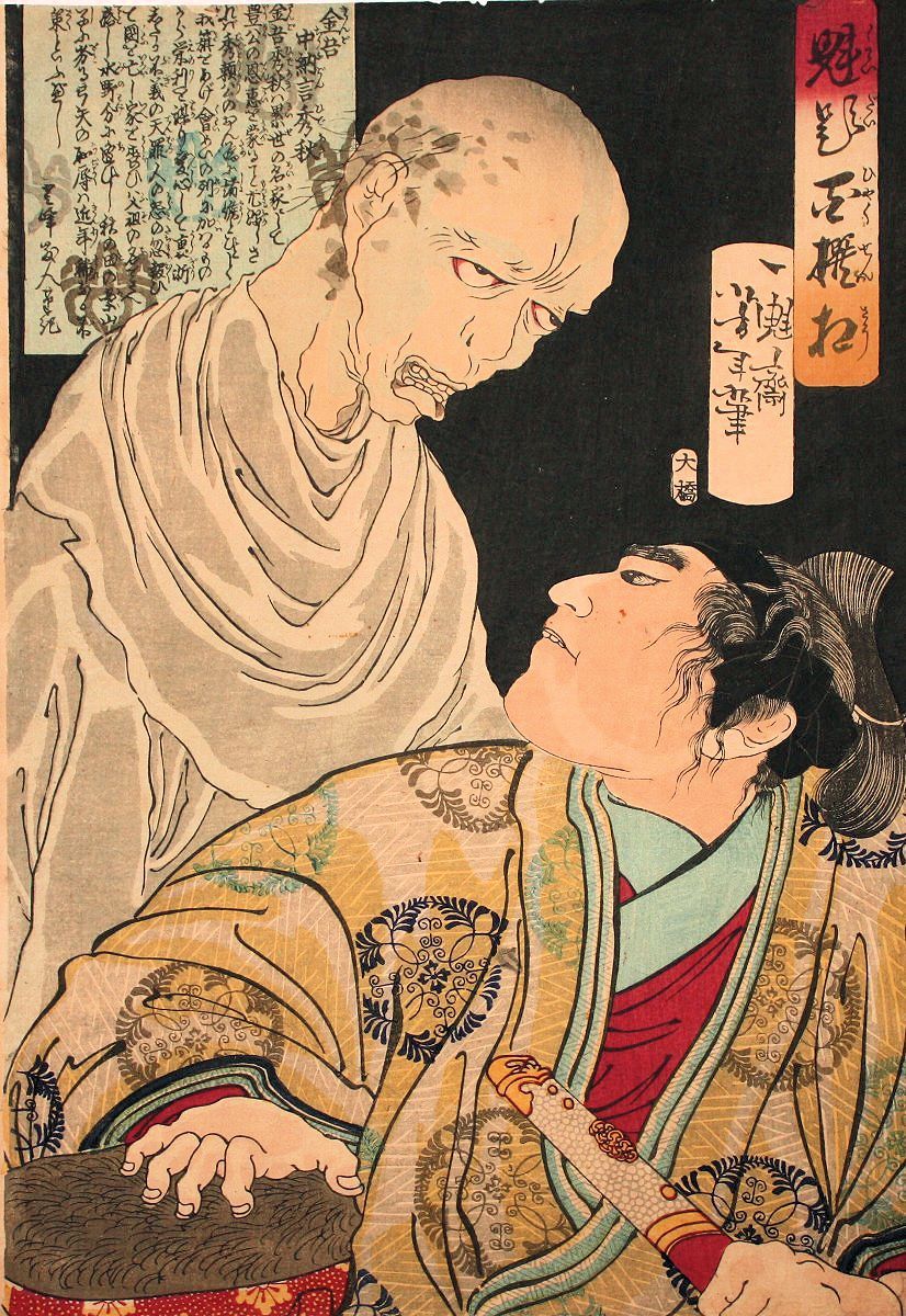 In der Edo-Zeit (1603 - 1868) gab es ein beliebtes Gesellschaftsspiel namens „Hundert Geschichten“, bei denen die Gäste sich gegenseitig Gruselgeschichten erzählten. Nach jeder Geschichte wurde eine Lampe gelöscht, bis die ganze Gesellschaft im Dunkeln saß. Die Geschichten hatten meist einen philosophischen Hintergrund und behandelten Themen wie Schicksal, Ehre, unerfüllte Liebe und Verantwortungsgefühl.