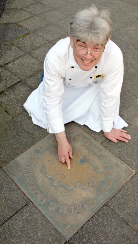 Ich steh‘ auf Düsseldorf – und zwar mittendrin. Das Herz von Düsseldorf schlägt in der Altstadt. Aber wo liegt eigentlich der Mittelpunkt Düsseldorfs? Lange Zeit war das die Martin-Luther-Kirche. Nach den Eingemeindungen von 1975 und einer Vermessung vom Juli 1991 liegt die geographische Mitte Düsseldorfs auf den Koordinaten 51 Grad 14‘ 12‘‘ nördlicher Breite und 6 Grad 48‘ 39‘‘ östlicher Länge. Das ist im Stadtteil Düsseltal an der Hans-Sachs-Straße/Ecke Peter-Janssen-Straße. Eine von der Düsseldorfer Bank und dem Heimatverein „Alde Düsseldorfer“ gestiftete Bronzeplatte weist dort im Bürgersteig seit 1992 auf diesen bedeutsamen Punkt hin. Und von hier aus starten wir diesmal unsere Tour in die Stadtteile.