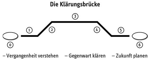 Der gesamte Klärungsprozess folgt einem klar strukturierten Modell, das zur Veranschaulichung «Klärungshilfebrücke» oder «Bridge over troubled water» genannt wird. Sie dient dem Klärungshelfer als Orientierung im Gesprächsverlauf, der – aufgeteilt in sieben Phasen – die Untiefen des Konflikts überwinden helfen soll.