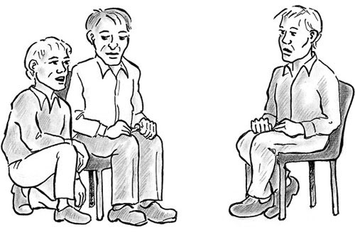 «Darf ich mal neben Sie kommen, etwas für Sie sagen, und Sie sagen dann, ob es stimmt?» Mit dieser immer gleichen Frage bittet der Klärungshelfer um die Erlaubnis zu doppeln. Wenn er die Einwilligung bekommt, begibt er sich von seinem Platz zu der betreffenden Person, geht neben ihr in die Hocke und spricht an ihrer Stelle die Gegenpartei direkt an. Anschließend fragt er die so «gedoppelte» Person, ob das Gesagte für sie genau so zutreffend ist. Bejaht diese nicht sofort und spontan, sagt er von sich aus: «Nein, stimmt nicht. Sagen Sie bitte selber, wie es stimmt.» Nach dem Doppeln geht er wieder zu seinem Platz zurück.