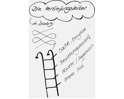 Der Klärungshelfer bewegt sich beim Doppeln wie auf einer Leiter, Sprosse um Sprosse von der Sachebene in die Tiefe der schwierigen (negativen) Gefühle. Was er dabei sagt, orientiert sich an den folgenden vier Ebenen: