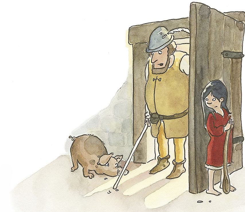 „Noch schlimmer?“, sagte Trenk böse. „Wie sollte das denn wohl sein? Wir haben nichts zu essen, unseren Vater prügelt der Herr Ritter windelweich, und unser Ferkel nimmt er uns jetzt auch noch weg!“