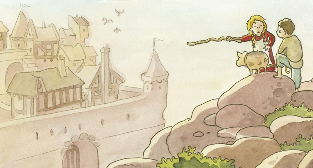 „Wenn du auch in die Stadt willst, kannst du mit uns kommen“, sagte er großzügig. Denn das Mädchen war natürlich nur ein Mädchen, und damals glaubten die Menschen tatsächlich, dass Mädchen zart und schwach und ängstlich und, wenn es ums Kämpfen ging, nicht sehr nützlich wären; aber trotzdem hatte Trenk das Gefühl, dass er sich vielleicht ein bisschen wohler fühlen würde, wenn er auf seinem Weg durch die Nacht außer einem Schweinekind auch noch ein Menschenkind bei sich hätte. „Ich kann dich auch beschützen.“