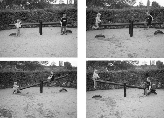 Die beiden Kinder wiegen unterschiedlich viel. Die Bilderfolge zeigt, dass sie sich dann im Gleichgewicht befinden, wenn das leichtere Kind sich vom Mittelpunkt der Wippe weiter weg bewegt als das Kind mit größerem Gewicht.