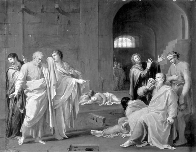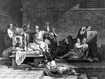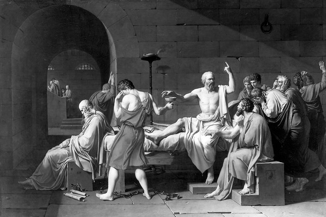 Der von den Athenern zum Tode verurteilte Sokrates schickt sich an, umringt von wehklagenden Freunden, den Schierlingsbecher zu leeren. Im Frühjahr des Jahres 399 v.Chr. hatten drei Athener Bürger ein gerichtliches Verfahren gegen den Philosophen angestrengt. Sie beschuldigten ihn, die Staatsgötter nicht anzubeten, religiöse Neuerungen eingeführt und die jungen Männer Athens verdorben zu haben – und ihre Vorwürfe wogen so schwer, dass sie die Todesstrafe forderten.