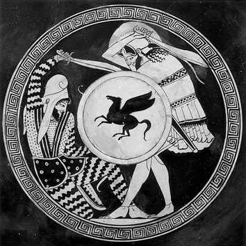 Die Griechen waren auch eine militaristische Gesellschaft und hielten viel von Tapferkeit auf dem Schlachtfeld. Einen richtigen Mann zeichnete aus, dass er wusste, wie man Widersachern den Kopf abschlägt. Der Athener Soldat, der einen Perser vom Leben zum Tode befördert (wie auf einem aus der Zeit des zweiten Perserkrieges stammenden Teller abgebildet), demonstriert, wie man das macht.