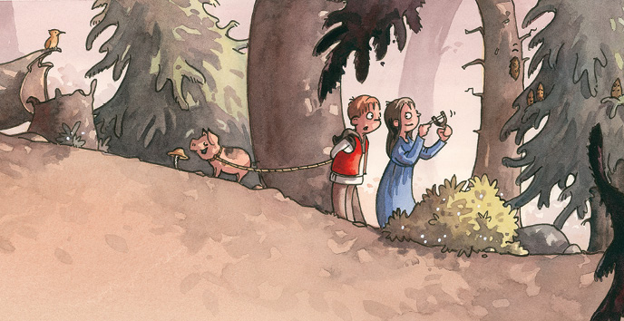 »Ich pass auf dich auf, und du passt auch mich auf«, sagte Trenk versöhnlich. Und weil Ferkelchen gerade am Wegesrand einen leckeren Pilz aufgestöbert hatte und darum nicht weitergehen wollte, sagte er noch: »Und wir beide passen zusammen auf Ferkelchen auf.« Und da hatte Thekla wieder gute Laune.