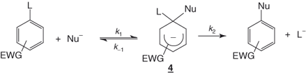 A general nucleophilic aromatic SNAr substitution can be described by Eq. (1.1), in which Nu represents an anionic or a neutral nucleophile and L a good leaving group or nucleofuge. A leaving group L can bear no charge (F, Cl, Br, I, NO2, OR, OSO2R, etc.), becoming negatively charged following displacement, or it can be positively or negatively charged (NR3+, SO3−), becoming uncharged or more negatively charged when displaced [1–8]. The abbreviation EWG is used to denote the presence of one or more (electron-withdrawing group)s (e.g., NO2 in the aromatic ring). Because the presence of an EWG is of fundamental importance to induce the process, an SNAr reaction is commonly referred to as an activated aromatic substitution process. Interestingly, Eq. (1.1) also applies to many heteroaromatic systems, whether they exhibit some intrinsic π-deficiency, for example, pyridine and other fully aromatic nitrogen heterocycles, or not, for example, pyrroles, thiophenes, and furans [9].