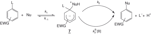 For neutral nucleophiles (e.g., water, alcohols, amines), the postulated mechanism is shown in Eq. (1.4). In this case, the initially formed σ-adduct 7 is zwitterionic and in most cases contains an acidic proton, which can be removed by a base such as the nucleophile itself. Conversion of 7 to products can therefore occur via an uncatalyzed k2 pathway or via a base-catalyzed