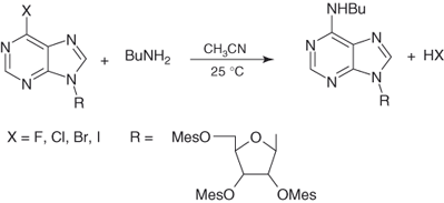 In view of the relatively similar activation provided by aza and NO2 groups, it is reasonable to anticipate that SNAr substitutions of pyridine and other azine derivatives will proceed through two-step pathways of the type shown in Eqs. (1.3) and (1.4). As a matter of fact, the observation of base catalysis in substitutions of haloazines with amine nucleophiles is consistent with Eq. (1.4) [14]. Another significant finding is the observed departure sequence F > Cl, Br > I in the SNAr substitutions of 6-X-substituted purine nucleosides with aliphatic amines as well as methoxide or thiolate anions in acetonitrile or DMSO, as depicted in Eq. (1.7) [99]. As discussed later, the sequence is the one expected for a rate-limiting nucleophilic addition step in Eqs. (1.3) and (1.4).