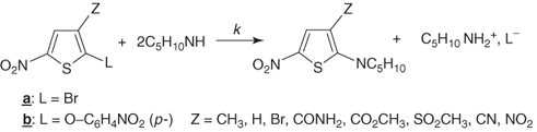 Changes in reactivity caused by variations in the nature of the activating substituents have been in many cases successfully correlated by Hammett relationships [107, 109, 110]. The kinetics of piperidino debromination of 2-bromo-3-nitro-5-Y-thiophenes and the corresponding selenophenes in ethanol have been very informative (Eq. (1.8)) [107, 109–111]. The high positive ρ values (≈3.2) found for these reactions, together with the necessity of using σp− instead of σp constants in the correlations indicate that the transfer of the negative charge has made notable progress in the transition states, suggesting a complex-like structure [109]. Importantly, the Hammett equation was also found to fit changes in reactivity brought about by variations in the nature of the ortho-like Z substituents [111]. Figure 1.3 shows the Hammett plots for substitution of various 2-bromo- and 2-p-nitrophenoxy-3-Z-5-nitrothiophenes with piperidine in methanol (Eqs. (1.9a) and (1.9b)). The existence of such linear energy ortho correlations is peculiar to five-membered ring heterocycles, where steric effects of substituents ortho to the site of the nucleophilic attack are minimized. Of further interest is that the ρ values for the reactions shown in Eqs. (1.9a) and (1.9b) (≈4.02 and 3.56, respectively) are higher than those for the reactions of Eq. (1.8), indicating that substituents exert a higher electronic effect on the reaction center in the ortho-like rather than in the para-like position. This behavior which has been termed the “hyperortho relationship,” is now well documented in the chemistry of five-membered ring heterocycles [110, 111].