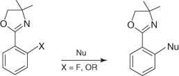 A number of electron-withdrawing heterocyclic functionalities exhibiting an activating effect (σp = 0.5–0.6), comparable to that of CN or CF3 groups have been successfully employed to activate SNAr displacements of good leaving groups, such as F, NO2, and OCH3, in aromatic systems [70, 115]. These include, among others, azomethine, thianthrene, benzoxazole, benzotriazole, quinoxaline, benzimidazole, oxadiazole, triazole, phenylquinoxaline, and triazine moieties located in a para or an ortho position relative to the leaving group. Many azole-activated SNAr transformations involving departure of a NO2 or F group have been described in the recent literature [70, 115, 116]. In particular, this activation has proved to be very efficient in the synthesis of a variety of polyaryl ethers incorporating the heterocyclic units [70, 115]. Another heterocyclic moiety worth mentioning, which is utilized to promote SNAr substitutions is an oxazoline ring. In fact, an oxazoline-mediated SNAr methodology developed by Meyers et al. has been extensively employed in the synthesis of biaryl systems as well as of numerous important aromatic targets (Eq. (1.10)) [73, 117].