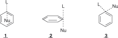 Major features of SNAr substitutions are that they occur without rearrangement and, when uncatalyzed, they display kinetics and response to structural and environmental factors that indicate a bimolecular mechanism [1–8]. In this regard, SNAr processes are formally similar to aliphatic nucleophilic SN2 substitutions but the view that the two displacements could proceed along analogous reaction paths was rejected quite early [1–3]. Should aromatic substitutions go via a concerted mechanism of the type established for SN2 reactions (Eq. (1.2)) would imply the formulation of transition-state models in which the benzene resonance is retained (e.g., 1, 2, or 3). However, all models of this sort were discarded by Bunnett and Zahler [1] because of violation of the Pauli principle and/or inconsistency with spatial requirements.