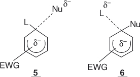 Because of the evident repulsion between a π-electron system and an approaching nucleophile, nonelectron-deficient benzene derivatives are intrinsically reluctant to suffer nucleophilic addition. On these grounds alone, it can be understood why the presence of EWGs is a key factor that determines the feasibility of SNAr reactions in general (Eq. (1.1)). Introduction of substituents such as NO2, CN, COR, CF3, and SO2R has the effect of lowering the electron density of the benzenoid system, especially at the o- and p-carbons, thus favoring nucleophilic attack at these positions. It remains therefore to be ascertained whether the process can result in the formation of relatively stable cyclohexadienyl intermediates such as 4 (Eq. (1.3)) and 7 (Eq. (1.4)).