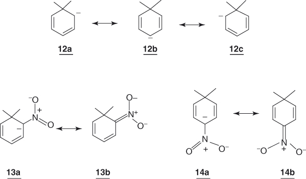 Let us consider first the unsubstituted cyclohexadienyl anion 12 and the contributing resonance structures 12a, 12b, and 12c. These structures do not violate any quantum-mechanical principle, while suggesting that the cyclohexadienyl anion can retain an appreciable amount of the resonance energy of the parent aromatic ring. More important, it could be anticipated that such structures will be more favored if the negative charge can be dispersed through electron-withdrawing substituents, especially those that are capable of conjugation in the positions ortho and para to the sp3 carbon. In particular, introduction of a group exerting a strong −M-effect, such as NO2, in these positions should lead to significant stabilization of 12, as shown in structures 13a ↔ 13b and 14a ↔ 14b.