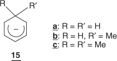 These predictions agree with theoretical calculations as well as with experimental data. Dewar [28] has calculated that formation of a cyclohexadienyl ring from a benzene ring is associated with a decrease of only 41.80 kJ mol−1 (ΔGcalc in Eq. (1.5)) in resonance energy; that is, 12 retains a large portion of the original stabilization energy. On the other hand, a number of calculations have been made that have confirmed that 12 may be properly represented by valence structures 12a ↔ 12b ↔ 12c and have indicated a greatest π-population at the para position [29–31]. Analysis of 1H and 13C NMR data obtained in liquid ammonia for the cyclohexadienyl anions 15, which were produced by proton abstraction from the corresponding 1,3-dienes or 1,4-dienes, have led to similar conclusions [30]. Importantly, these studies have also demonstrated that the ring system of such anions is planar, with no homoaromatic overlap1 occurring [29–31, 33].