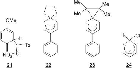 On the above theoretical grounds, it is quite reasonable to envision that a number of SNAr substitutions will proceed through the addition–elimination mechanisms of Eqs. (1.3) and (1.4), involving cyclohexadienyl anions of sufficient stability, to be true intermediates along the reaction coordinates. Interestingly, there are experimental data that are in agreement with this view. For structural reasons to be discussed later in this chapter, many activated arene–base interactions cannot proceed further than the addition step, providing opportunity for a direct study of the formation of potentially stable σ-adducts [4, 6, 13, 38]. The long-known trinitro adducts 8 and 9 are prototype examples but many other trinitrobenzene (TNB) as well as dinitrobenzene adducts have been characterized, including in the gas phase, by X-ray crystallography (Chapter 2) [39–43]. A large number of adducts derived from activated arenes containing no NO2 groups have also been identified, for example, 18–20 [44–46]. Also consistent with theoretical predictions, the experimental evidence is that the stability of the adducts strongly decreases as the number and/or efficiency of activating groups in the benzene ring is reduced, making it difficult to firmly identify monosubstituted adducts. The only unequivocal exception is the recent NMR characterization of the adduct 21 that formed initially as a mixture of two diastereomers on treatment of 4-nitroanisole with the carbanion of α-chloromethyl p-tolyl sulfone [47]. However, increasing the possibility of delocalization of the negative charge through an exocyclic phenyl ring has allowed the NMR characterization of the spiro adducts 22 and 23, which contain no EWG groups. They are formed from the reaction of biphenylylchloroalkanes with alkali metals in THF (tetrahydrofuran) at −70 °C [48]. As a remarkable example of an SNAr stepwise process in which the activation is provided by the presence of a positively charged leaving group, there is the reaction of the iodobenzene cation with Cl−. Using femto second resolution, Zewail et al. have demonstrated the formation of the intermediate σ-complex 24 – in this case, a delocalized cyclohexadienyl radical – along the reaction coordinate [49].