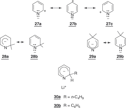 Pyridine and other fully aromatic nitrogen heterocycles – often considered to be aza-substituted arenes – are π-deficient [4, 9]. Replacement of a ring carbon in an arene system by a more electronegative nitrogen atom results in a greater electron density on that atom, with a concomitant reduction in electron density on the remaining carbon atoms. This deficiency favors nucleophilic attack, and therefore nucleophilic substitution of a suitable leaving group, especially at the α- and γ-positions to the heteroatom (resonance structures 27a–c). Concomitantly, the formation of the corresponding aza-cyclohexadienyl intermediates 28 and 29 is facilitated by the somewhat lower aromaticity of the parent substrate and the ability of the nitrogen atom to stabilize such adducts by accommodating the negative charge, as shown in 28b and 29b. Contrasting with the failure to form 12 from benzene, the aza σ-adducts 30a and 30b have been directly obtained on treatment of pyridine with butyllithium in ether or in hexane and phenyllithium in N,N,N′,N′-tetramethylethylene diamine, respectively [75–77]. Both calculations and NMR studies indicate that the ring systems of the 2-pyridyl anion 28 and the 4-pyridyl anion 29 are planar, showing that introduction of the aza functionality does not affect the geometry of the cyclohexadienyl anion [78, 79].