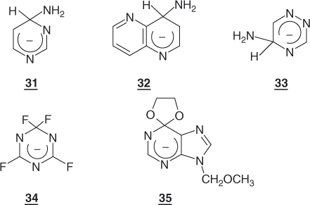 Further evidence for a strong activating effect of the aza group is given by the observation that 1,3-diazines such as 4-chloropyrimidine or 2-chloropyrimidine show an SNAr reactivity approaching that of 2-chloro-5-nitropyridine and 2-chloro-3-nitropyridine, respectively [9, 83, 84]. On the other hand, comparison of the last two entries in Table 1.2 shows that, despite the electron-donating effect of the anilino moiety, the hydrolysis of the symmetrical 2-anilino-4,6-dichloro-1,3,5-triazine proceeds essentially at the same rate as that of picryl chloride in aqueous solution [93, 85]. The notable activation of monoazines (including quinolines) of diazines (including pyridazines, pyrazines, naphthyridines) and related substrates such as purines, and of triazines (including the nonsymmetrical 1,2,4-triazines) is also demonstrated by the successful characterization of a number of σ-adducts, for example, 31–35 [94–98].